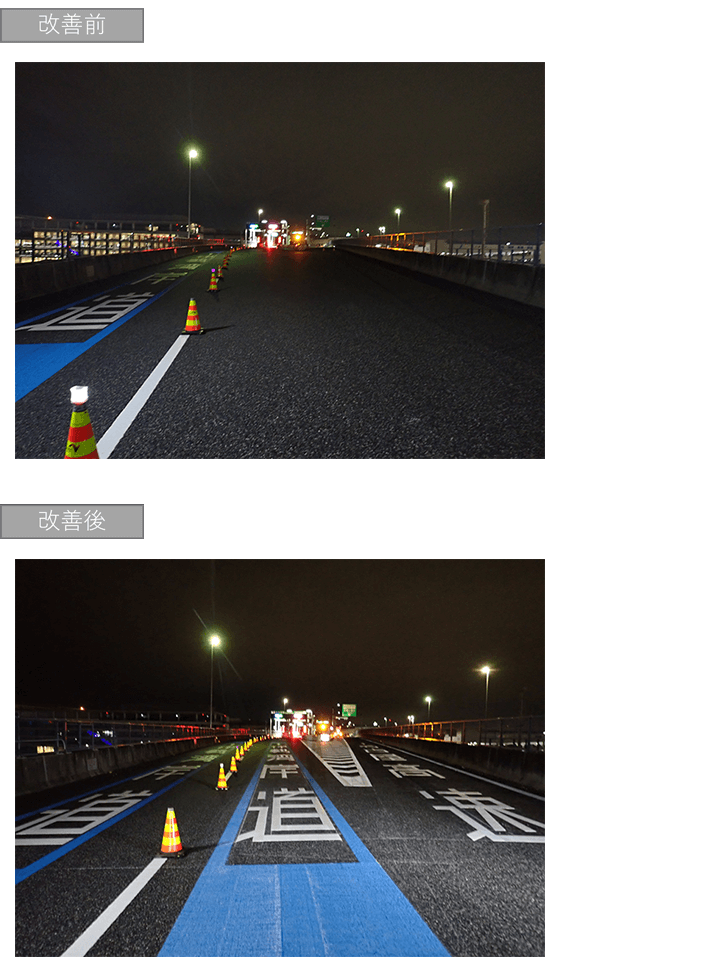 分岐直前の車線変更がないように、路面標示の改善を行いました。